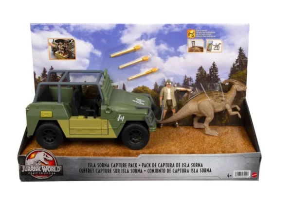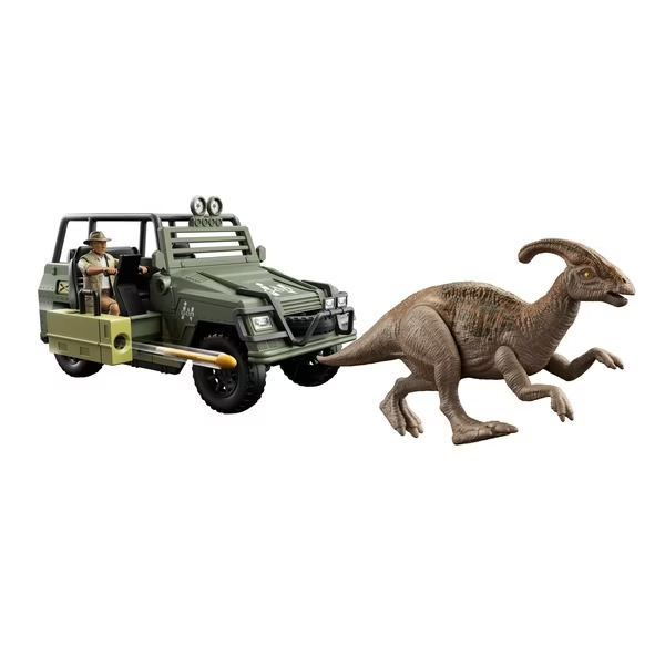 En effet, ce coffret contient une figurine de Roland Tembo, un chasseur de gibier qui avait été choisi dans les films par Peter Ludlow pour aller capturer des dinosaures à Isla Sonra, mais aussi une figurine de dinosaure (un Parasaurolophus), ainsi qu’un véhicule et 3 projectiles.