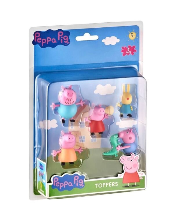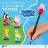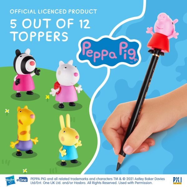Pack de 5 figurines Peppa Pig, hauteur entre environ 5 et 6 cm avec un trou sous la figurine permettant d’y insérer un crayon.